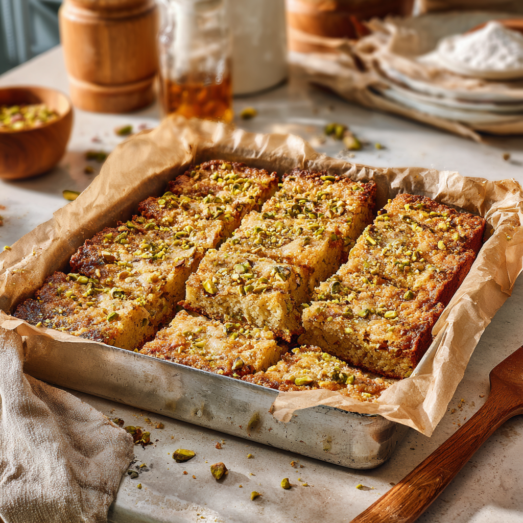 - Fold in pistachios, spread into pan, and bake for 20–25 minutes.