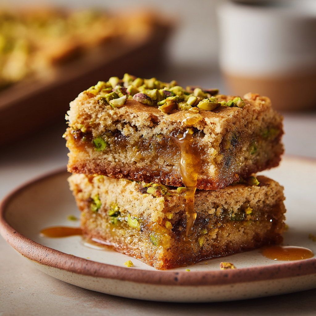 - Cool and finish: Allow the bars to cool completely before slicing. Drizzle with honey and sprinkle extra pistachios if desired.