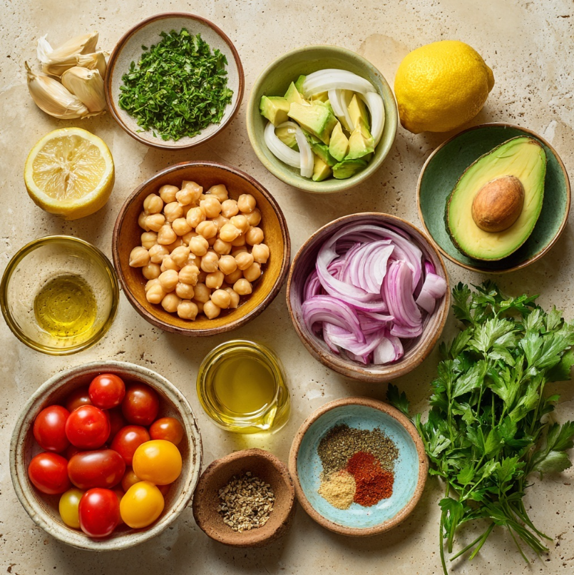 The combination of chickpeas and avocado creates a hearty base, while fresh vegetables and lemon dressing add brightness and balance.
