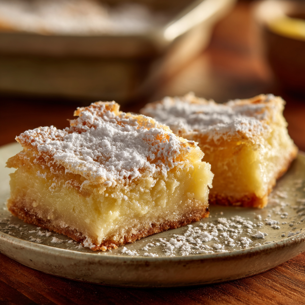 Buttery shortbread crust topped with a smooth, tangy lemon filling and dusted with powdered sugar.