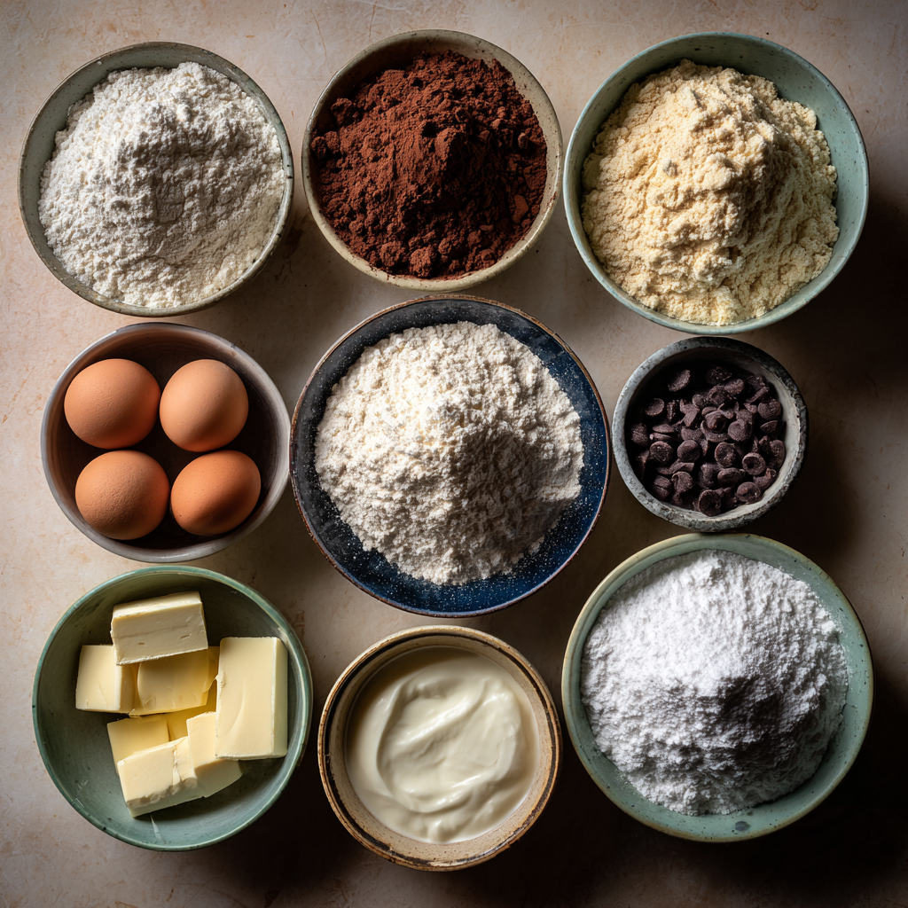 - In a large bowl, whisk together flour, sugar, cocoa powder, baking powder, baking soda, and salt.
