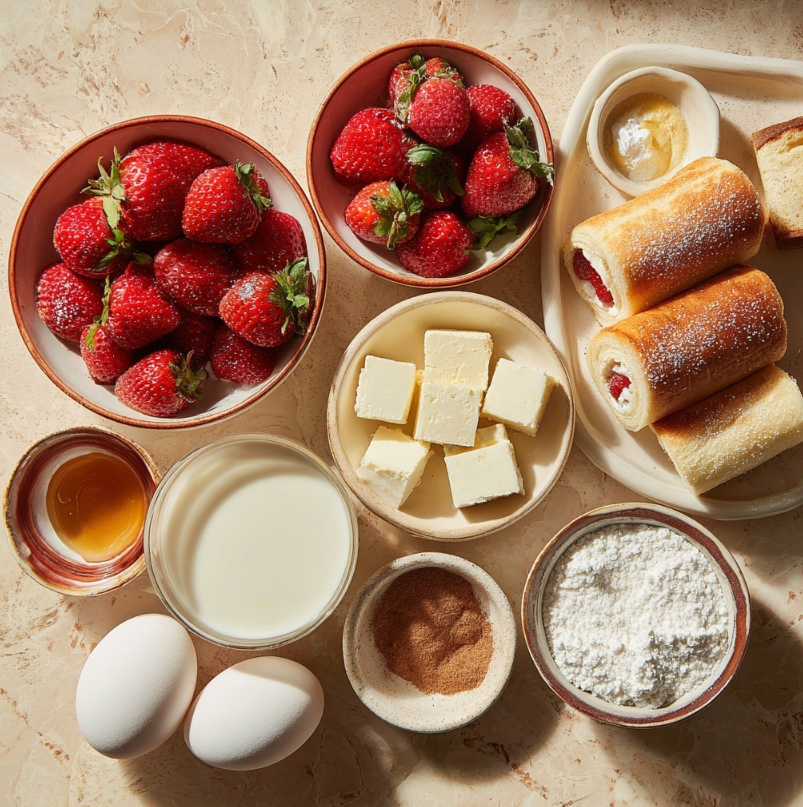 Spread a thin layer of the strawberry cream cheese mixture onto each slice of flattened bread. Roll tightly into a log shape, pressing lightly to seal. - Prepare the Egg Mixture