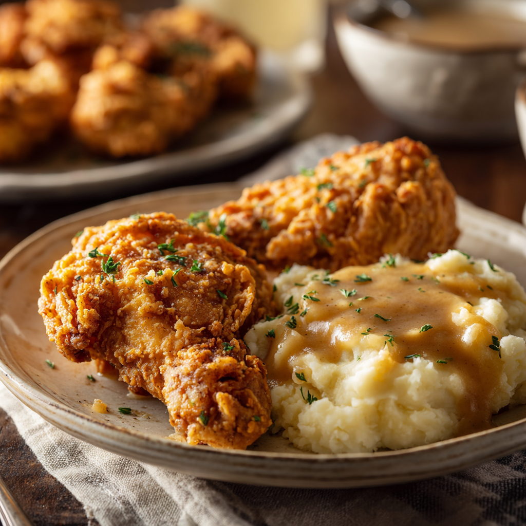 This recipe strikes the perfect balance between crispy coating and juicy chicken. The seasoned flour ensures every bite is packed with flavor, while the buttermilk keeps the meat tender. The creamy pepper gravy adds richness, turning a simple fried chicken dish into a comforting, restaurant-quality meal.